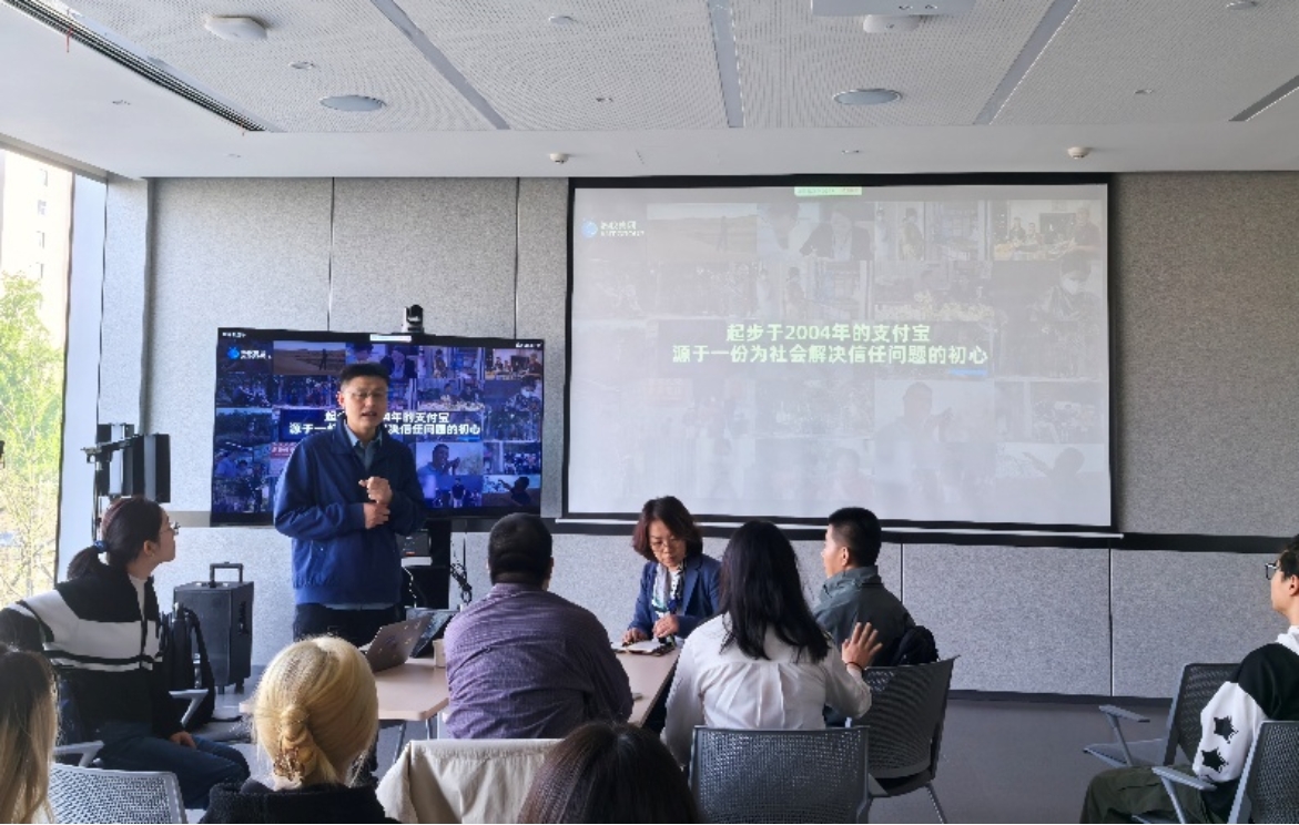 参访师生首先参观了蚂蚁T空间,了解了蚂蚁集团的企业环境和员工文化。随后,在梭梭树会议室,以“为每个人,数字时代普惠公益之路”为题,支付宝公益平台负责人、蚂蚁公益基金会副秘书长黄庆委介绍了支付宝公益平台的业务板块及其背后的故事与设计逻辑,蚂蚁公益基金会女性公益项目总监卜家珺介绍了蚂蚁公益基金会的重点项目——数字木兰。