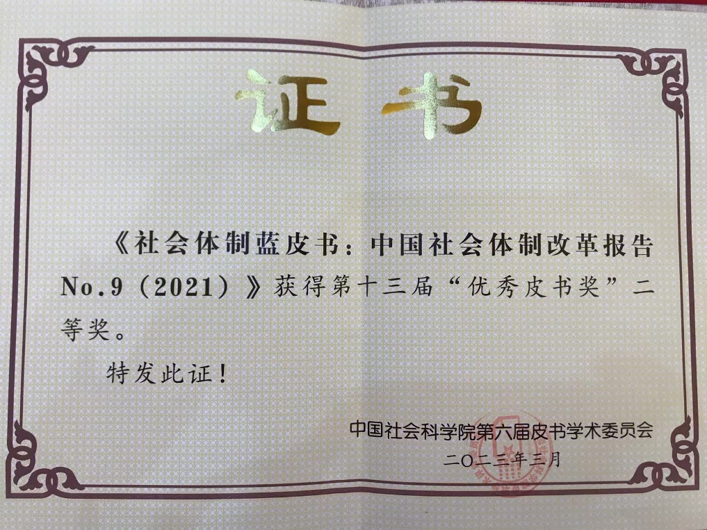 《社会体制蓝皮书》社会影响力不断扩大,2015年和2016年的社会体制蓝皮书在数百种蓝皮书中脱颖而出,连续两届获得优秀皮书二等奖;自2017年起,“社会体制蓝皮书”同步在香港出版繁体中文版。据悉,“优秀皮书奖”评选的主要依据是政治与学术导向、主题价值和意义、科学性、规范性、原创性、前沿性、时效性、媒体报道情况等。2022年度,共有425种2021年版皮书符合优秀皮书奖评选要求,经过初评、复评和终评,共52部皮书获得第十三届“优秀皮书奖”,其中,一等奖15部,二等奖19部,三等奖18部。