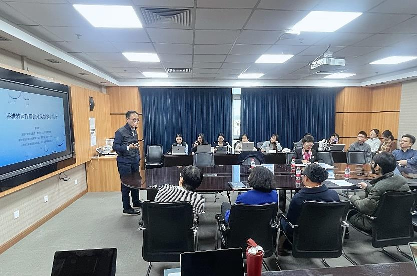 讲座中,聂德权教授基于自身在香港特区政府多年的工作经验,详细介绍了 香港特区政府政策制定和实施的重点内容,主要涉及香港特区政府的宪制秩序、 组织结构和公务员制度等方面,强调了“一国两制”是中国特色社会主义的伟大 创举,必须长期坚持。聂教授辨析了基本法框架下香港特区政府主要官员、政治委任官员和高级公务员之间的核心区别,并重点阐释了香港特区政府的政治委任制度和公务员制度。聂教授又以长者生活津贴为例, 从实践角度清晰呈现了香港特区政府社会福利政策制定的全过程,包括政策目标确立、政策工具选择、利益主体博弈、执行策略运行以及政策效果评估等多个关键环节。聂教授在总结中指出,香港和内地需要增进相互理解和认识,两地官方和民间的有效沟通是维护“一 国两制”长期稳定发展的重要保障,而跨区域的科技和学术交流则将推动粤港澳大湾区经济社会的加速发展。