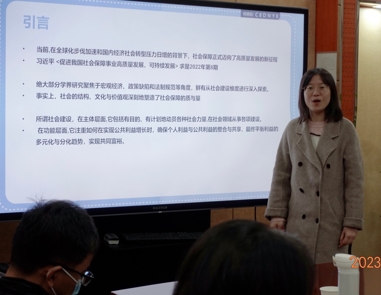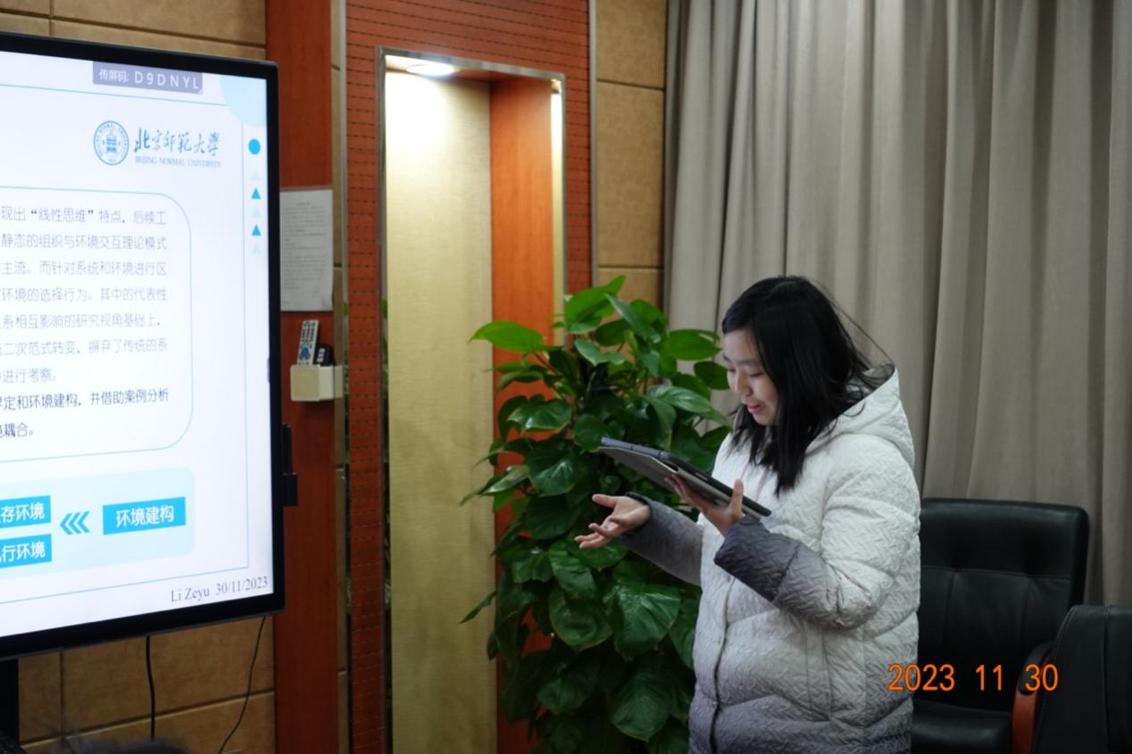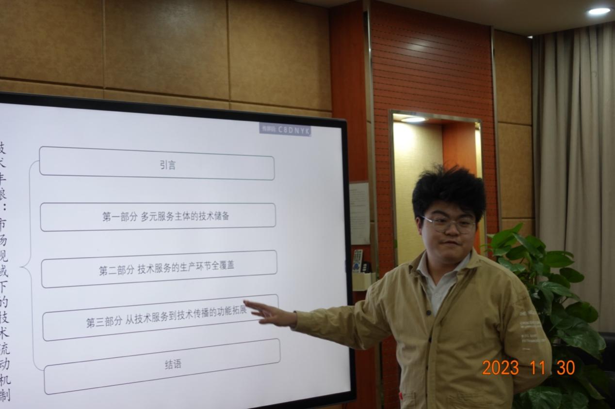 随后,论文汇报正式开始。韦瀚深同学(2021级本科)关于市场视域下技术流动机制的分享,研究扎实,饱含学术理想。徐子越同学(2021级本科)深入探讨了学生自治与公民培养的互构关系,问题意识清晰,观点新鲜。韦瀚深同学(2021级本科)还分享了全民学习型社会发展状况,他们团队(唐岩锋,2021级本科;贾骏硕,2021金融学本科;高翔宇2022经济学本科)通过数据分析展现了细致全面且数据量庞大的研究成果。张睿同学(2023级博士)关于社会建设与社会保障高质量发展的分享,内容丰富,立意深远。李学舒同学(2021级博士)对小农生产何以存续的案例剖析,规范到位,富有学术吸引力。李泽宇同学(2023级硕士)聚焦项目制背景下的社会组织再生产,展现了精湛的理论应用与学术语言。