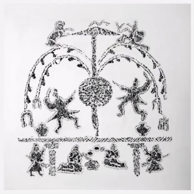 王霄冰教授还借用袁广阔教授的研究梳理了鱼纹画的发展,以至汉代画像石所蕴含的丰富民俗信息。在洪山汉代画像石祠《建鼓舞》中,画面分上下两部分,上格刻画“建鼓舞”,二人双手执桴击建鼓,建鼓上有两层幢,饰羽葆和华盖,一个羽人和猴子攀援其上;下格刻画宴饮图,两人跽坐于酒樽前,酒樽中放有一勺,二人高举耳杯畅饮,似在欣赏歌舞,两侧各有一人持剑守护。