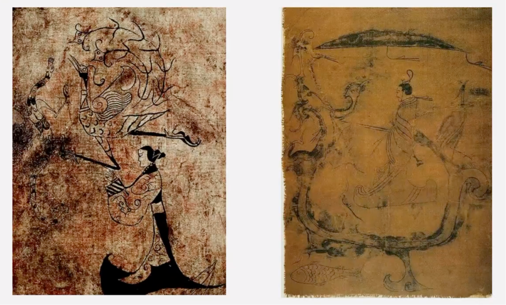 右:长沙子弹库楚墓出土帛画《人物御龙图》