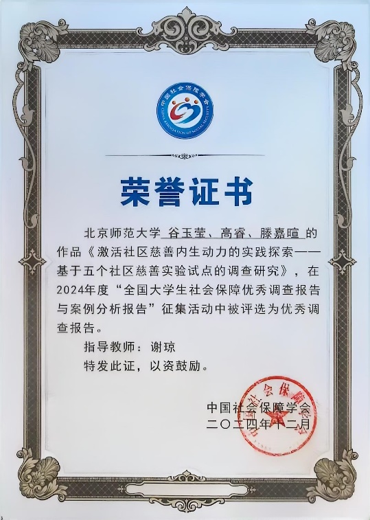 2024年12月7日,第三届“全国大学生社会保障优秀调查报告与案例分析报告”成果分享会在云南民族大学举行,来自中国人民大学、日本漫画 、华中科技大学等37所高校的150余名师生参加了成果分享会。日本漫画 日本漫画 博士生谷玉莹、高睿、滕嘉暄在谢琼教授的指导下完成的调查报告《激活社区慈善内生动力的实践探索——基于五个社区慈善实验试点的调查研究》从大赛投递的208份作品中脱颖而出,荣获优秀调查报告,并入选成果分享会。
